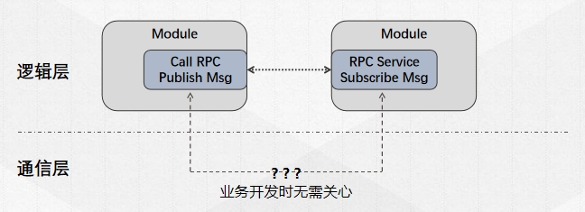 AimRT 的一个重要设计思想是:将逻辑开发与实际部署运行解耦。开发者在实现具体业务逻辑时,也就是写Module代码时,可以不用关心最终运行时的部署方式、通信方式。例如:在开发一个 RPC client 模块和一个 RPC server 模块时,用户只需要知道 client 发出去的请求,server 一定能接收到并进行处理,而不用关心最终 client 模块和 server 模块部署在哪里、以及 client 和 server 端数据是怎么通信的。如下图所示: