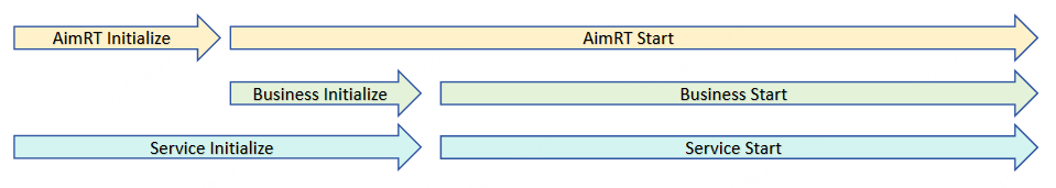 需要注意的是,AimRT 的Initialize阶段仅仅是 AimRT 框架自身的初始化阶段,可能只是整个服务初始化阶段的一部分。使用者可能还需要在 AimRT 的Start阶段先初始化自己的一些业务逻辑,比如检查上下游资源、进行一些配置等,然后再真正的进入整个服务的运行阶段。各个运行阶段关系如下图所示: